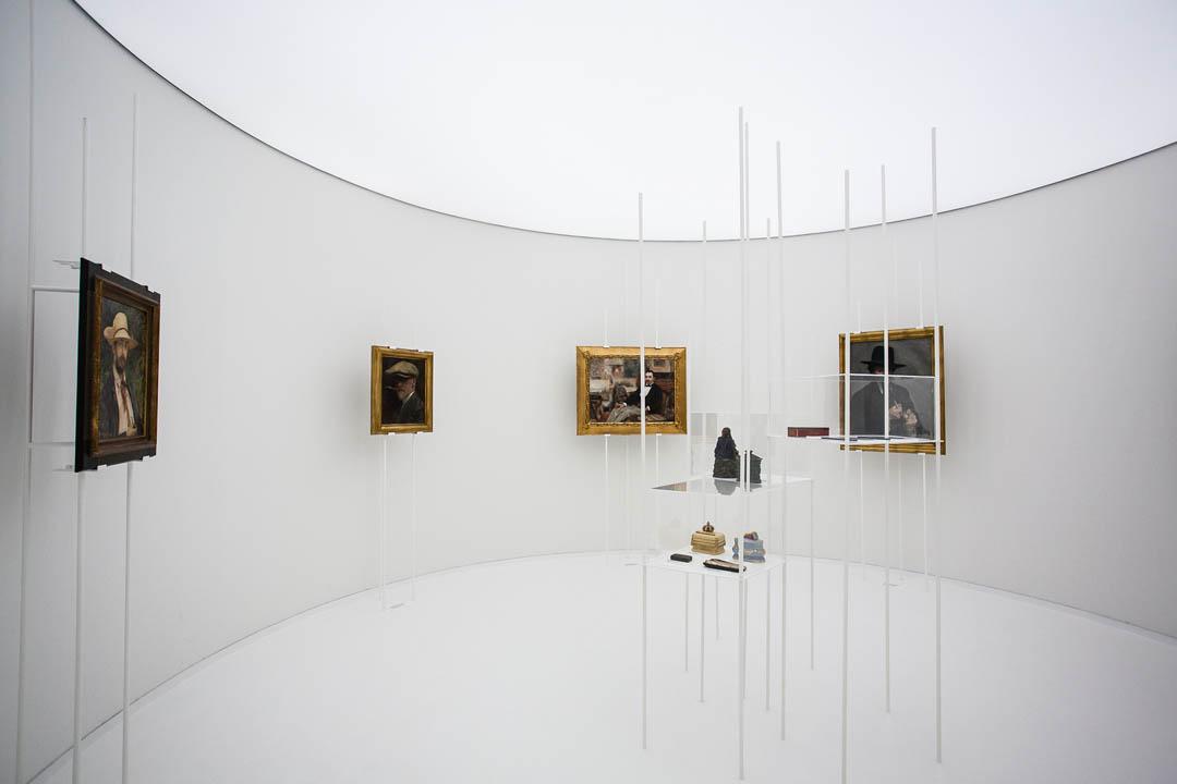 空间之中的画作和陈列物被专门的白色细小构架支撑。