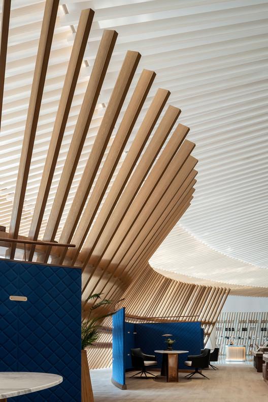 展厅里面的装饰是弯曲形状的大面积使用和开放空间的布局有助于创造环绕式的空间体验。整个空间的形状就像盛开的花朵,这盛开的花朵是一个贯穿整个设计的元素。接待区的白色大花瓣是设计的突出元素,而如主题挂件和沙盒区域的背景墙等其他元素则是对花卉主题的不同诠释。