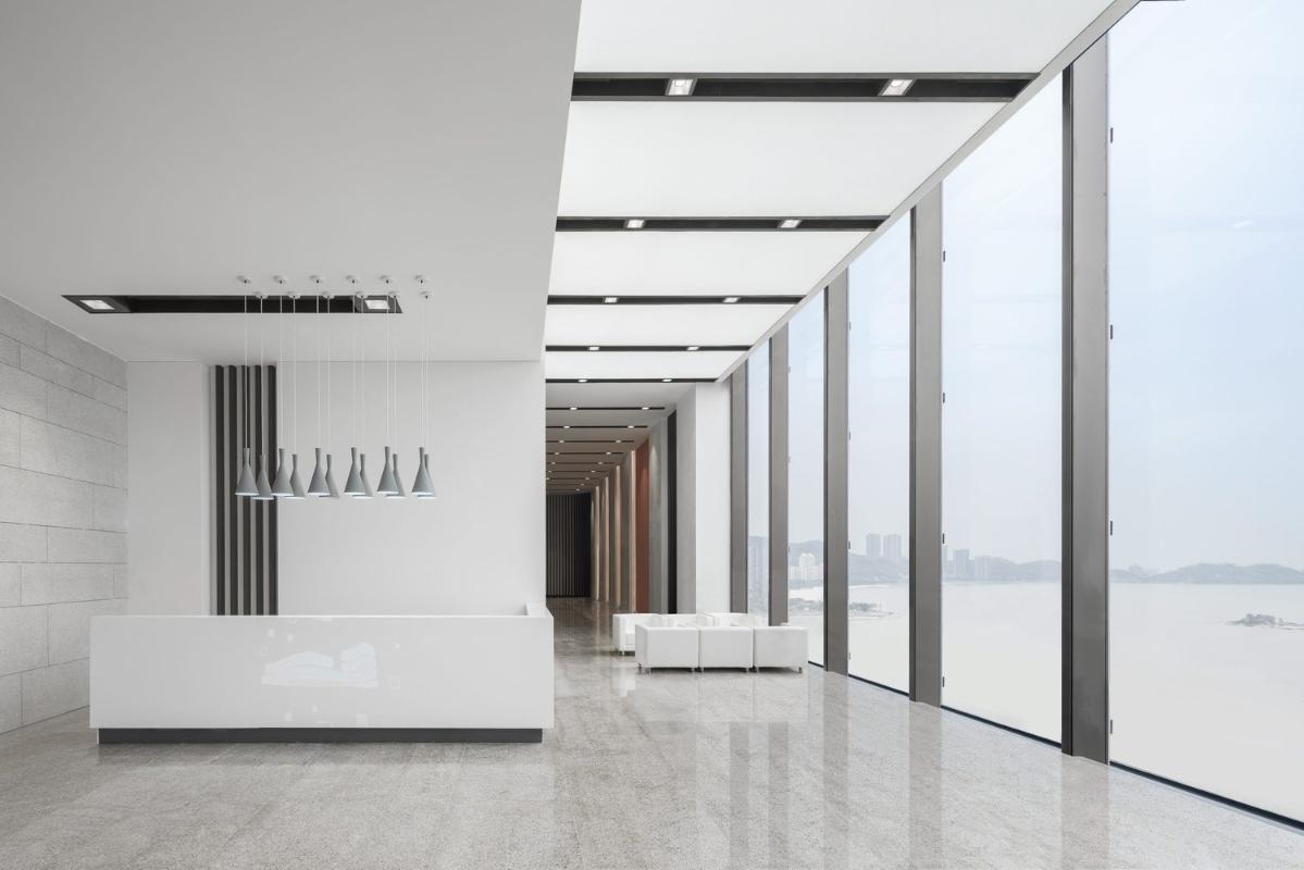 可移动式遮阳系统由铜黄色铝材构件组成,印刻出优雅传统的中式纹理。夜幕降临,柔和灯光点亮螺旋外观立面,弱化了石质水平墙面的厚重感,使得建筑在夜色中更加剔透灵动。八层的建筑立面以全玻璃幕墙代替了石质幕墙,在此香洲湾的景致也可以尽收眼底。