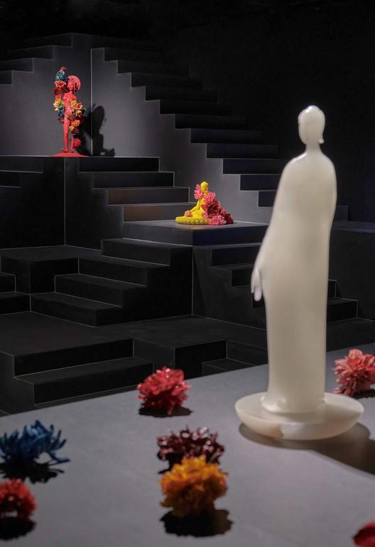 用大漆漆过用来供奉佛像的塑料花,同时,我们为展陈的佛像特别设计了两款佛龛,旨在为这在人们刻板印象中庄重肃穆不可近的器件增加一些温度,使之更贴近“日常的,安好的,既在远古又可亲近”的理念。我们将佛龛与家中常见的落地灯进行功能整合,并且沿用展览中层叠秩序的设计语言,在增添了佛像庄严、隐秘的仪式感的同时,更好的和空间以及空间中的人事物进行了一个既有形又无形的连接。而展场中的大型花艺装置,由艺术家好友Ian Hylton所作。西藏佛教信徒因物资贫瘠,好用塑料假花供养诸佛,受其启发,Ian重新审视了平日里漠视的素材,让它们在人为雕琢后焕发崭新之美。