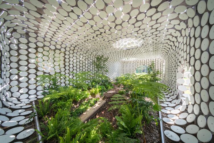 Egaligilo展馆是一个装置,并且代表了传统建筑和参数化建筑之间的张力,保留内部自然环境的同时也是两者之间的力量平衡。Egaligilo在世界语,一种旨在促进国际交流的语言,中意为均衡器。设计和建筑必须充当变革的推动者,作为一种积极应对全球挑战并制定解决方案以提高我们社会的生活质量的工具。Egaligilo与周围环境不断互动,不仅融入了公共空间,更在内部拥有一片生机勃勃的绿洲,象征主义在这里得到了充分体现,并且让游客可以与自然环境紧密联系。通过保留一系列维持内部小型云雾林所需的大气条件,展馆创造了其内部自己的微气候环境,光和雨水可以通过两层表皮渗入内部,使植物保持活力和生机。重叠表皮之间的开口和人工照明的效果可以在一天内创造出不同的场景,吸引观众进入展馆,重新定义内外之间的狭窄界限。
