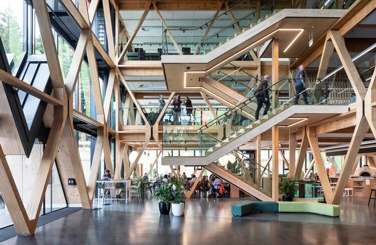 游客通过这些入口进入到三层通高的中庭,在这里,迎接观众的有木纤维技术展览和咖啡吧。立即映入眼帘的是三层楼高的斜撑木构,它塑造了整座建筑的主要骨架。这些结构单元是由高性能层压单板制成,并具有燕尾榫连接形式,在木材上开槽并用胶水粘合,来表达工艺感。从中庭向上看,上面的楼层提供了开放式布局的办公室和共享合作空间,这些更具私密性,在设计中也对隔声进行了考虑。