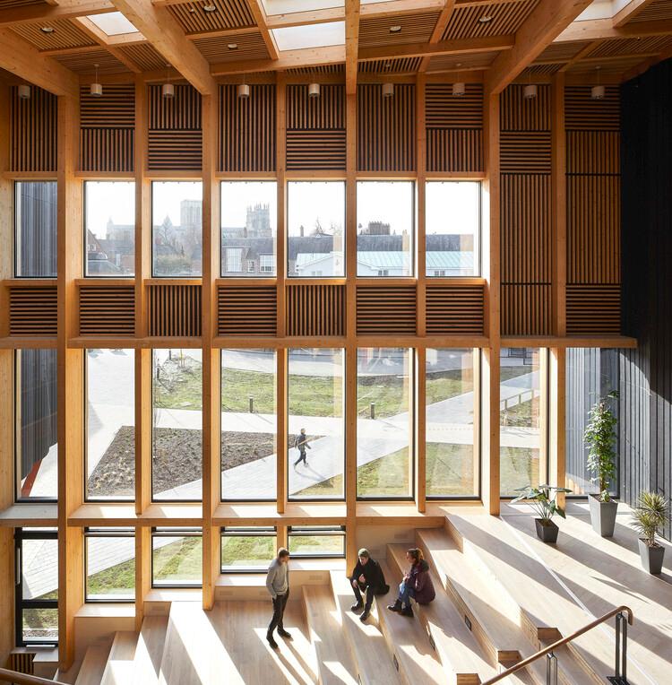 建筑师在约克圣约翰大学创意中心的设计中采用了“肌理优先”的设计方式,并采用了如胶合木及交错层压木材等大量低碳建材,由此在使用大量木材的同时,创造不同肌理、质感的内部空间。同时,项目还采用了被动式设计原则,从而在可持续设计上取得了 BREEAM 出色(Excellent)级别的评级。此外,建筑师与环境设计顾问 Atelier Ten 合作,他们在项目中采用了三层玻璃、打造气密建筑、提供如可开启窗户等简易的操作系统、并在教室运用由机械和自然通风共同组成的混合通风系统,由此让创意中心可以取得生态建筑的认证。