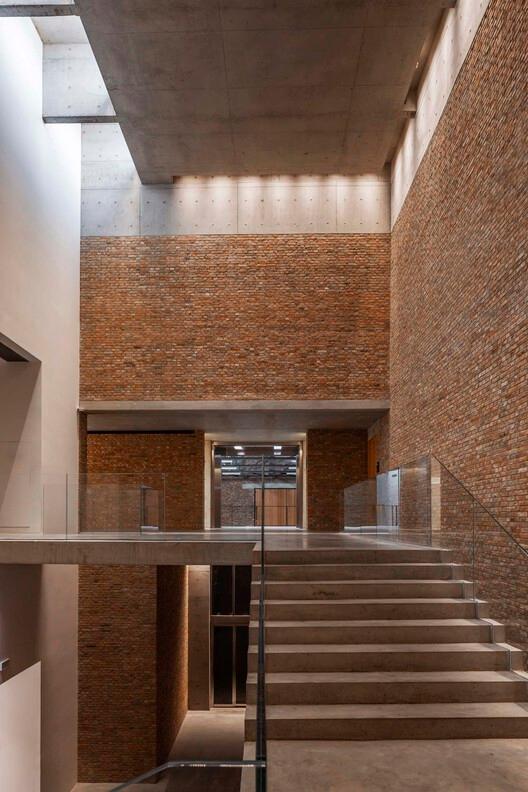 美术馆的设计也捕捉了798工业厂房的材料特点,以现浇混凝土、红砖为主要材料,着力突出这两种材料在结构形式与围护墙体之间的交接、转换的建构特点。