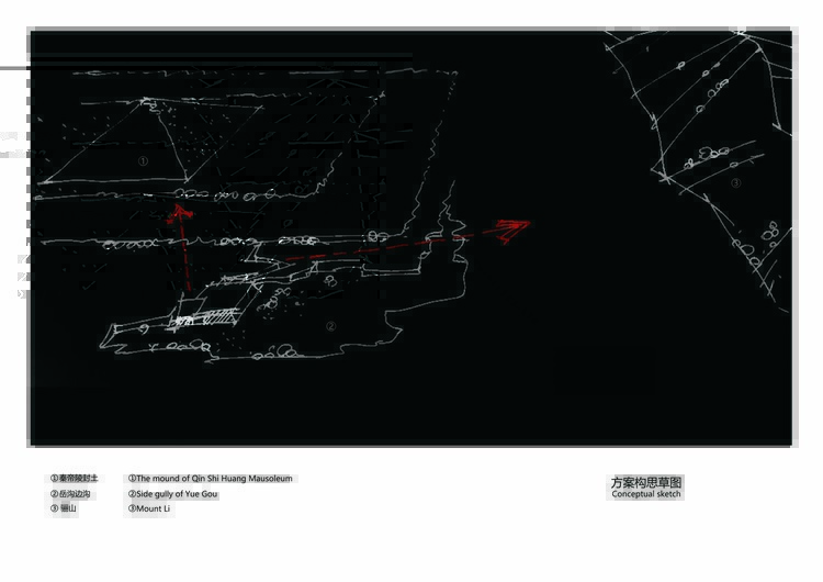 西安临潼,苍黛色的骊山东西绵延百里。从山脚缓缓向北坡降的广袤原野上,一座巨大的金字塔型的封土堆赫然耸立,孤独而倨傲。这是中国两千多年中央集权帝制的开创者——秦始皇帝赢政的陵墓。在当代中国城市高速发展的大潮中,陵寝周围仍然幸运地保持着公元前的山原空间架构,溢散着千年不曾衰减的第一位皇帝横扫六合的气势。秦始皇帝陵是中国首批进入《世界遗产名录》(1987年)的遗产地之一。在新世纪,西安市政府计划兴建一座博物馆,用以专门保护、展示和诠释陵区出土的两件国宝级文物"彩绘铜车马",同时尽可能地疏解分流兵马俑景区的巨量游客。这两乘彩绘铜车马出土于帝陵封土堆的西侧边缘,地下深约8米处。与举世皆知的兵马俑的恢宏阵列相比,铜车马只有真实尺寸的二分之一大小,但今人惊叹的是,这一对超写实风格的青铜器物,竟是由上千个细小的金属零部件拼组而成,其精致细腻巧夺天工,代表了两千多年前人类制造工艺的最高水准。在陵园的内外城垣之间,一座历史(约明代)上形成的深达数米的巨大冲沟(岳沟)为建设博物馆提供了唯一可用的场地——冲沟排除了一切地下埋藏文物的可能,这也成为中国国家文物局再三斟酌之后下决心在此处建馆的重要原因。“彩绘铜车马”出土四十年后能够再次回到封土陵山脚下,重新陪伴着世界上最神秘的帝王,机缘非同一般。